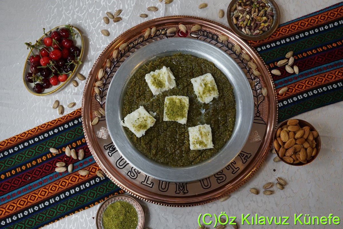 Antep fıstığı çekilmiş künefe şerbet üstünde Antep sahan kaymak fıstık ve eşsiz şerbeti ile servis edilir.