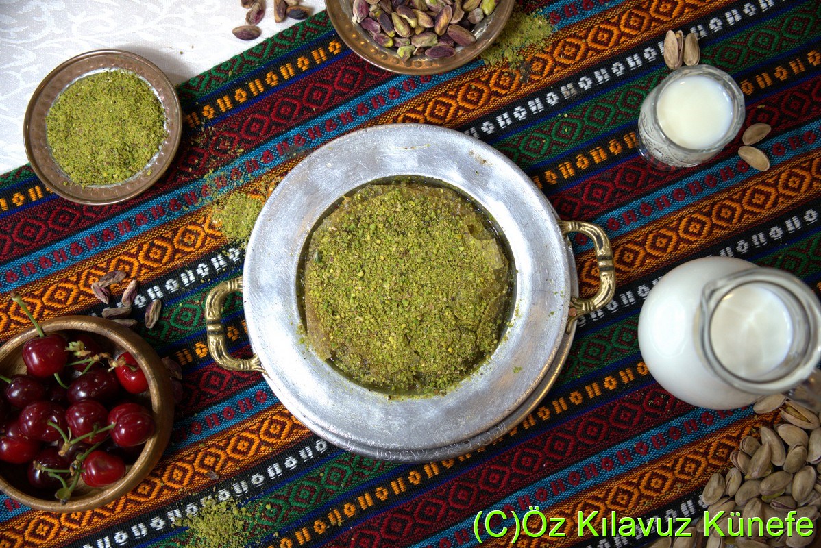 Üstü Antep katmeri altı künefe hamuru içinde peynir kaymak çekilmiş Antep fıstığı ve eşsiz şerbeti ile servis edilir.