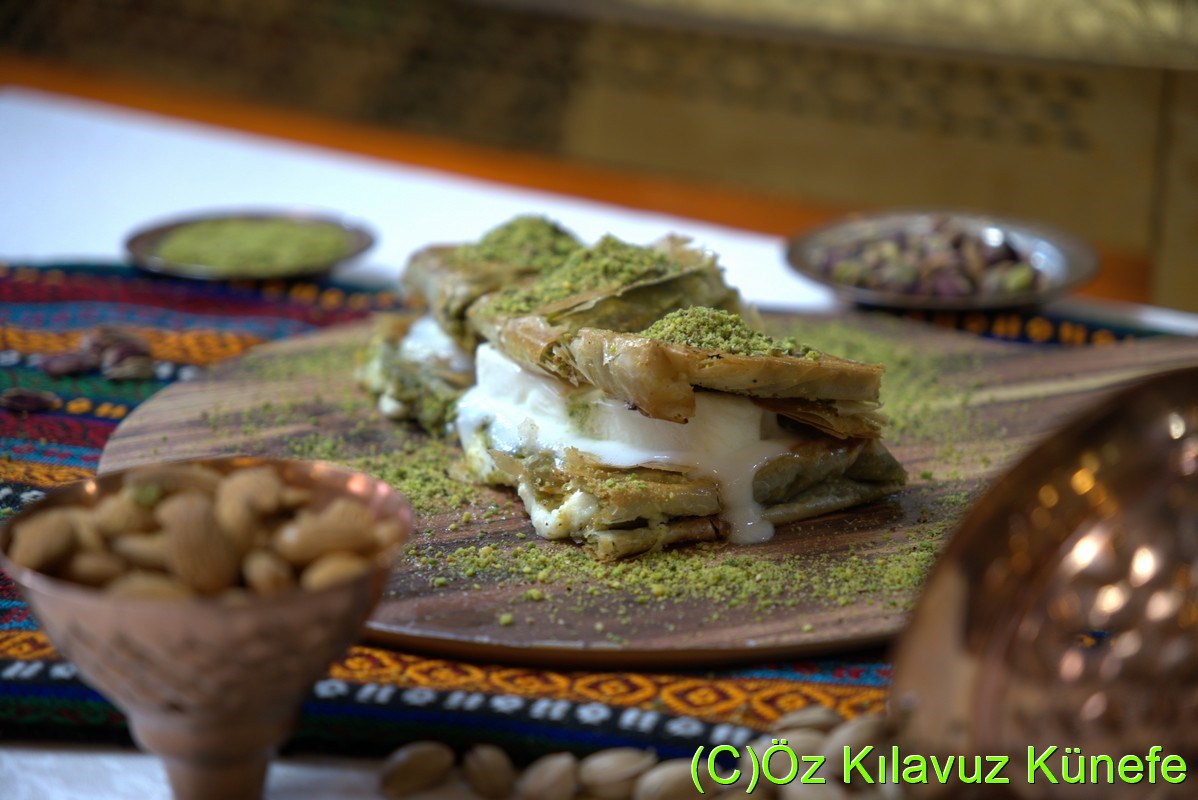 El açması Antep hamuru içine kaymak, çekilmiş Antep fıstıkla pişirilir. Arasına dondurma dilimlenir ve sarılıp toz şeker ile servis edilir.