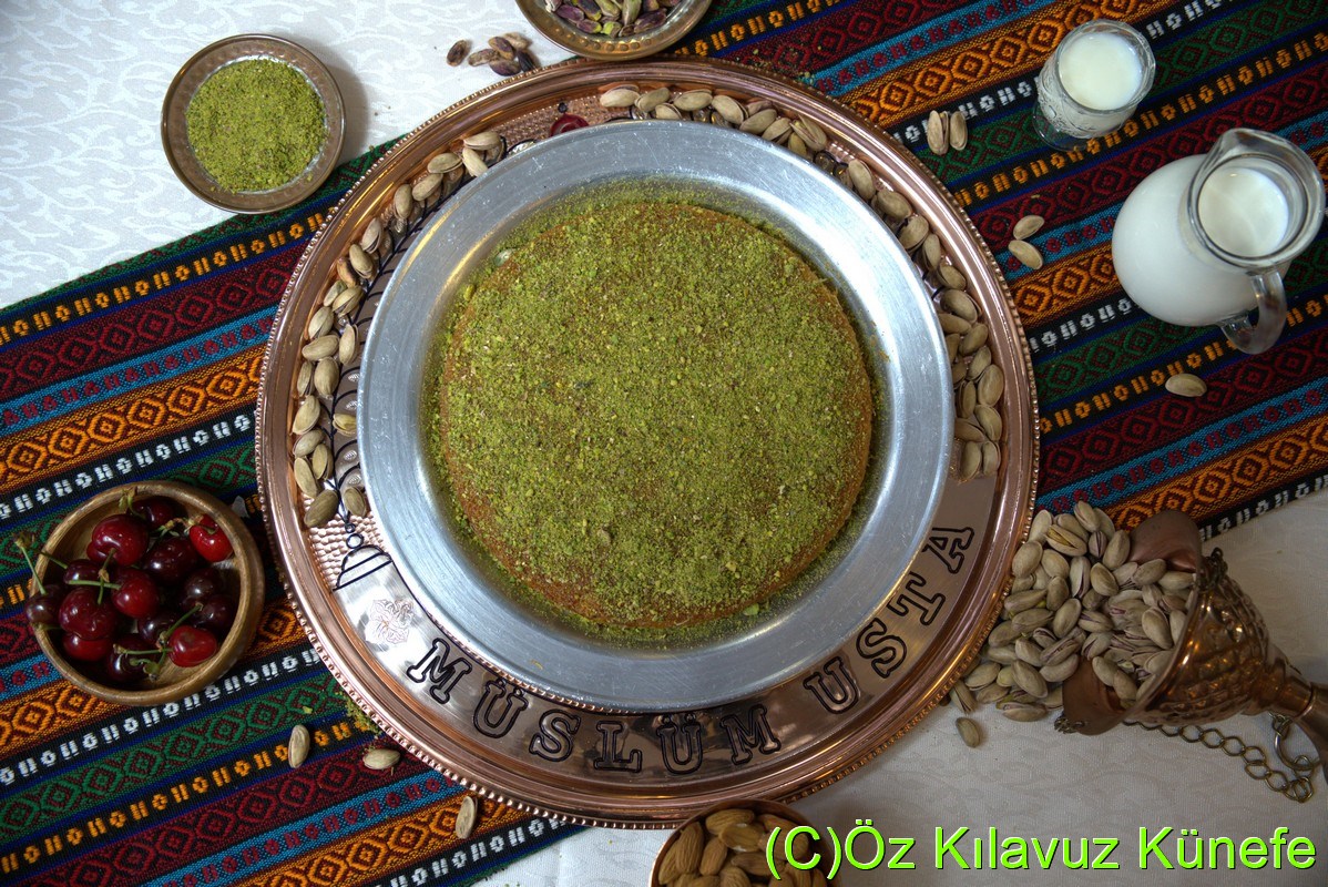 Hatay peyniri,çekilmiş Antep fıstığı, üstüne bol çekilmiş Antep fıstığı ve eşsiz şerbeti ile servis edilir.